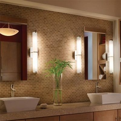 Un diseño de iluminación común para baños más antiguos puede presentar un accesorio central montado en el techo más un accesorio sobre el espejo. Un plan de iluminación mejorado eliminaría esos accesorios y los reemplazaría con tres apliques de pared, dos a cada lado del espejo y uno en una pared opuesta (desviación de la posición del espejo).