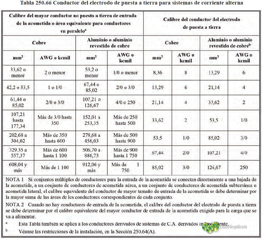 - Identifique el calibre del conductor de la acometida, luego ingrese a la tabla 250.66 y verifique el conductor hacia la puesta tierra equivalente (GEC) (Cu o Al).