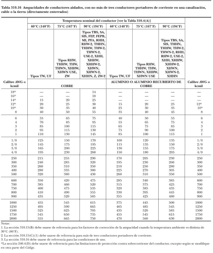 - Equipos de 100 A o menos o terminales para #14 AWG a #1 AWG → dimensiona por columna de 60 °C, salvo que el equipo esté marcado/certificado para 75 °C.