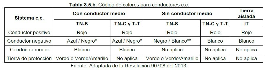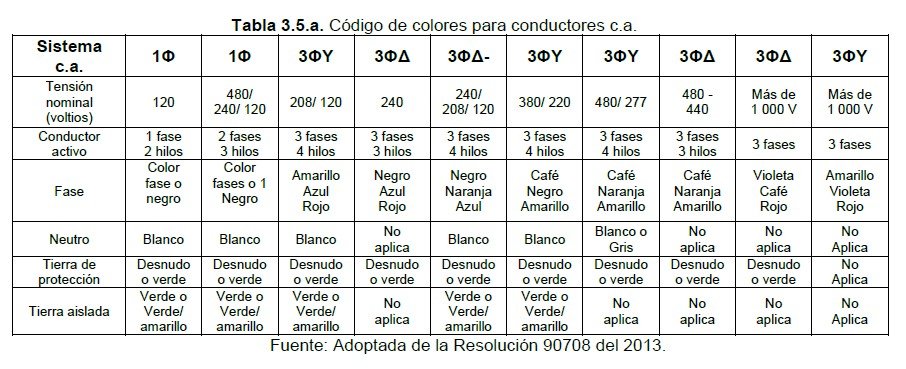 Con el propósito de evitar accidentes debido a una interpretación incorrecta del nivel de tensión y tipo de sistema, se debe cumplir con el código de colores para conductores aislados de potencia establecido en las Tablas 3.5.a y 3.5.b (según corresponda).